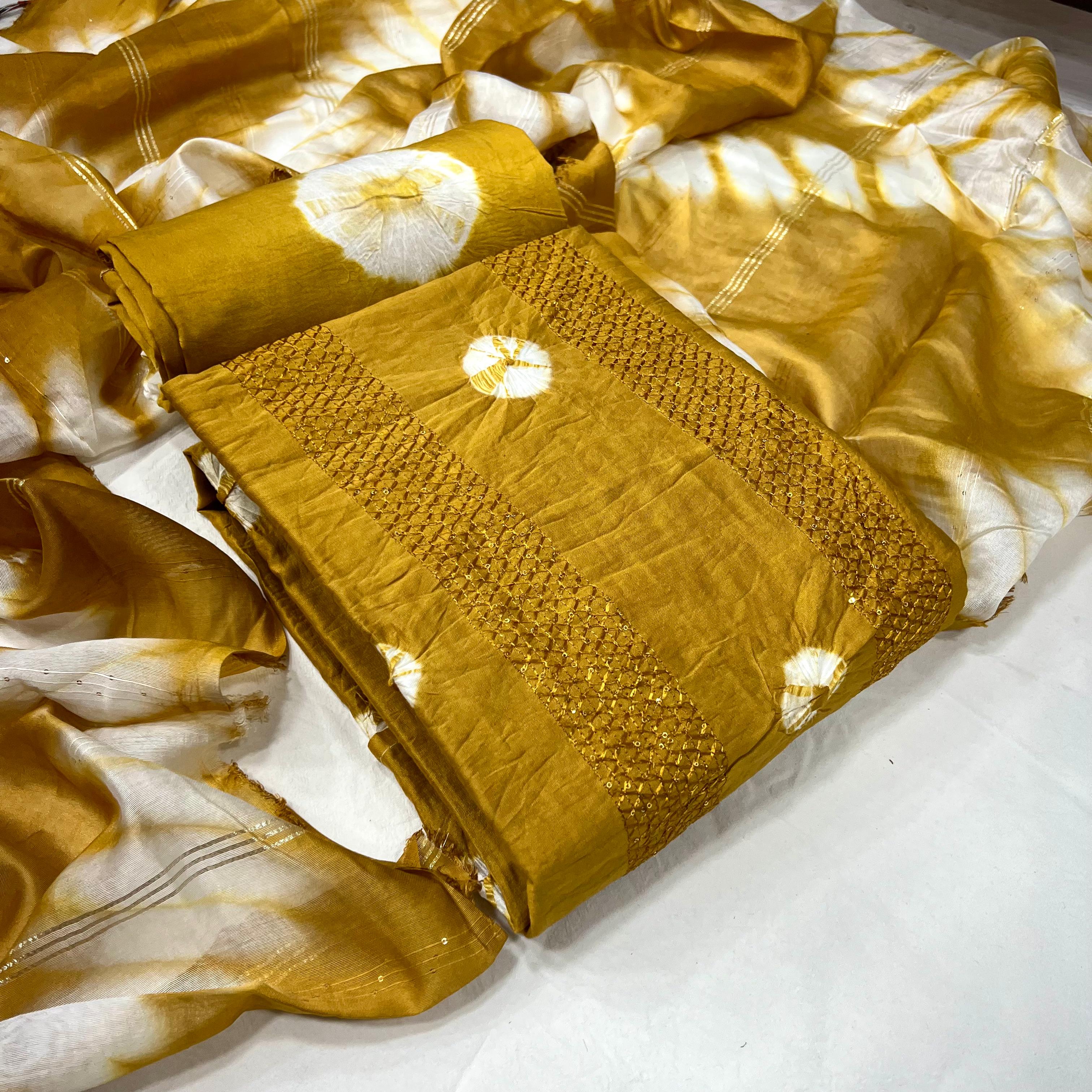 KT MAHARANI Mustard Pure viscose Cotton Bandhni sequence work Dress Materail has been successfully added to your cart .