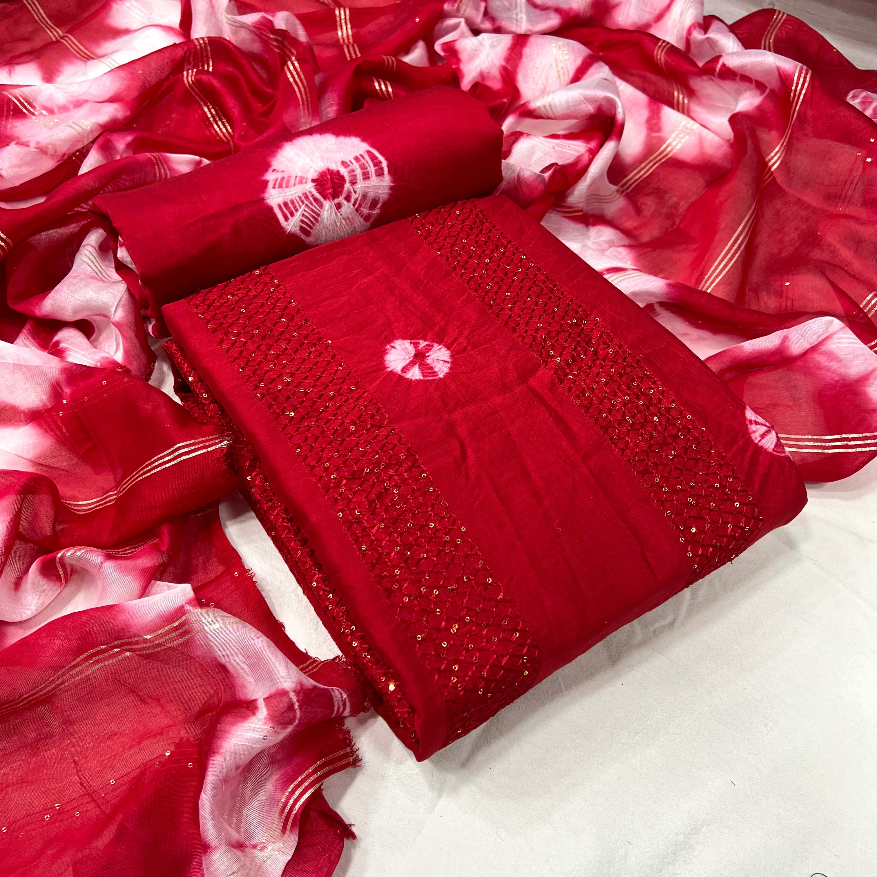 KT MAHARANI Red Pure viscose Cotton Bandhni sequence work Dress Materail has been successfully added to your cart .