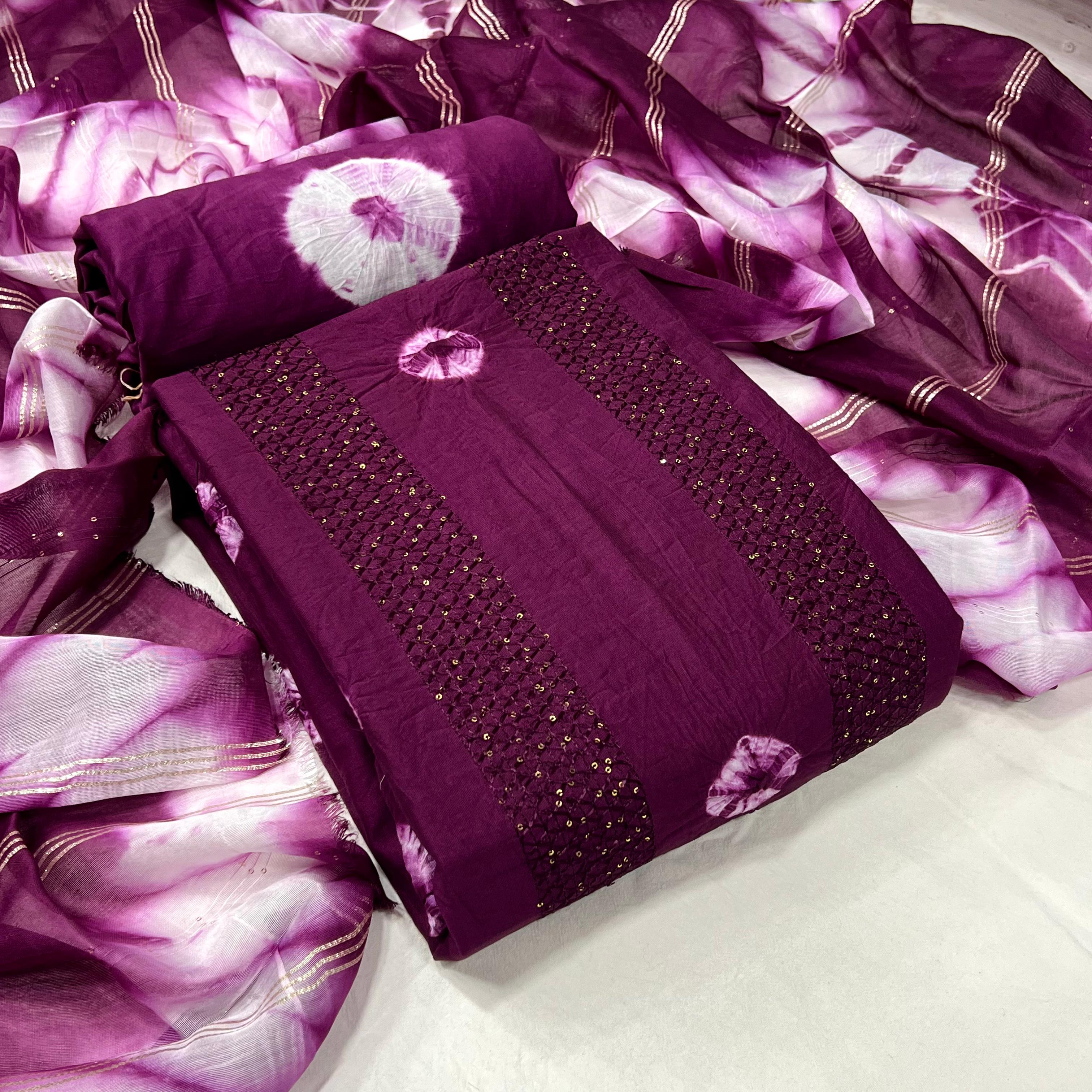 KT MAHARANI Wine Pure viscose Cotton Bandhni sequence work Dress Materail has been successfully added to your cart .