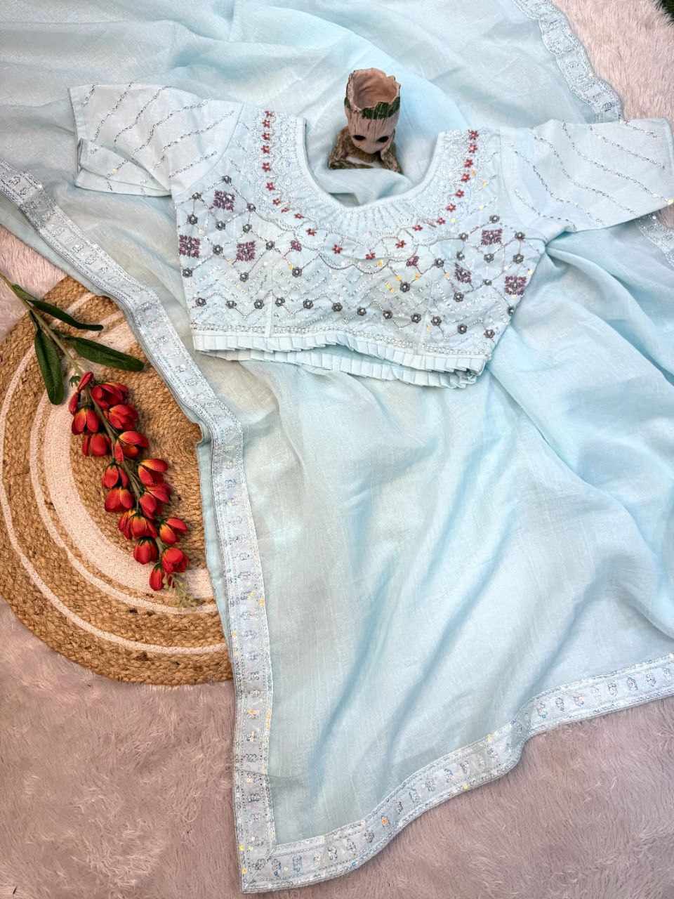Saree Fabric: Beautiful crush shining saree with beautiful heavy handwork with beautiful rainbow sequins attached VALMOTI lace on the saree.